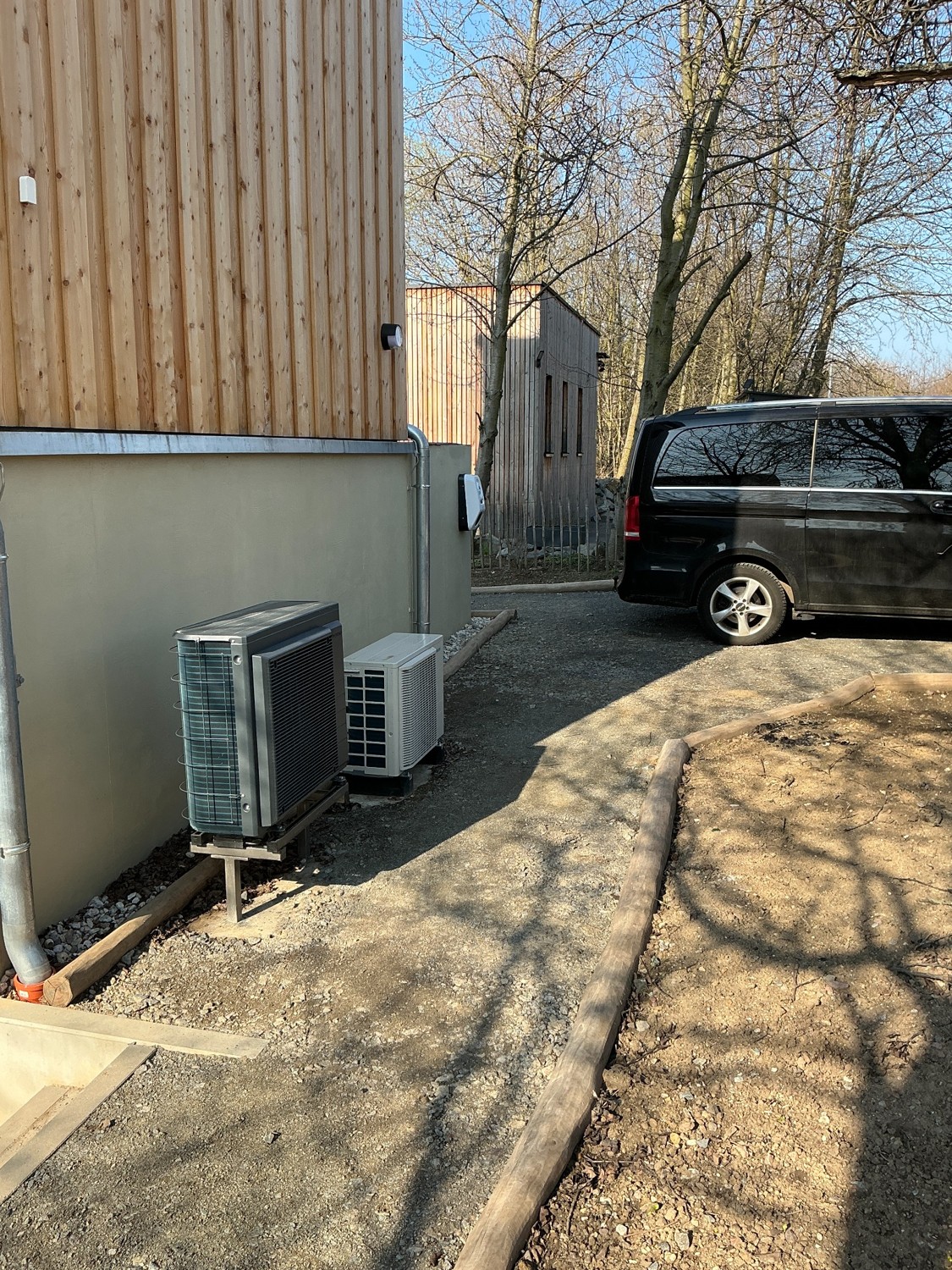 Holzdielenboden, große Couch, TV, Bluetooth-Lautsprecher, Spiegelkugel, Klimaanlage mit Heizfunktion