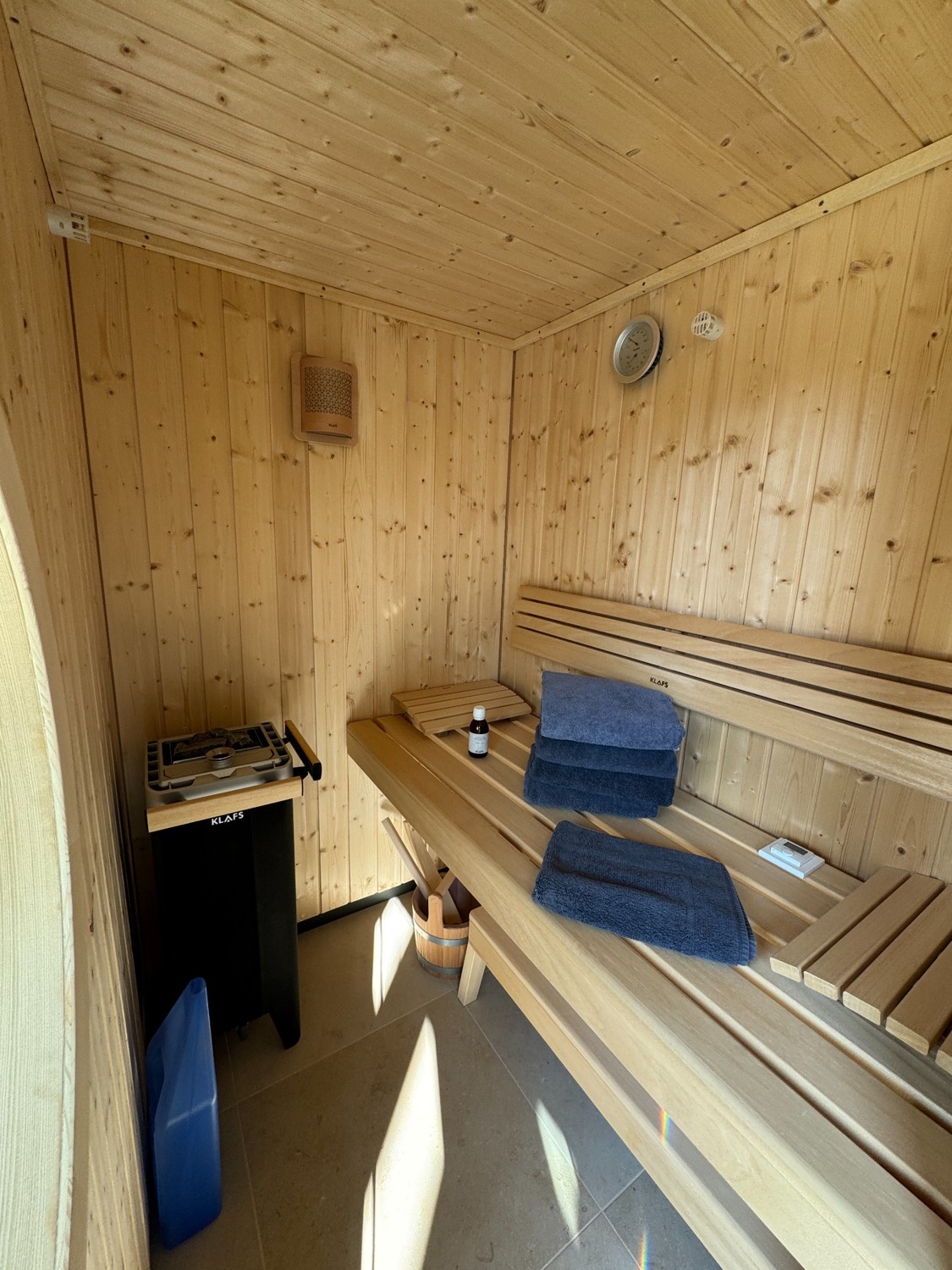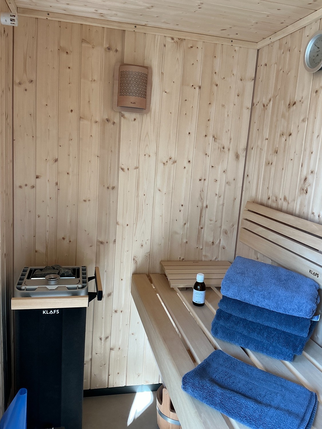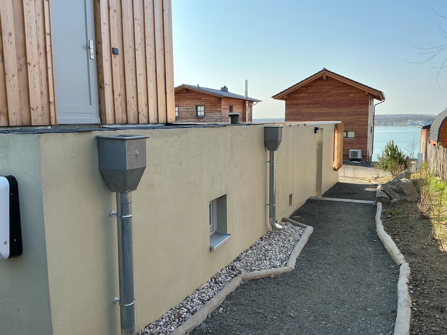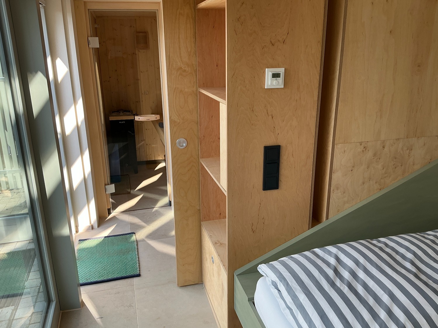 Im Erdgeschoss befinden sich ein gemütliches Schlafzimmer mit einem Bett (1,80 × 2,00 m), ein Bad mit Dusche, WC und Waschbecken sowie eine Sauna – perfekt zum Entspannen nach einem Tag am See oder in der Natur. Fliesenboden und Fußbodenheizung sorgen hier ebenso wie im 1. Obergeschoss für angenehmen Komfort.