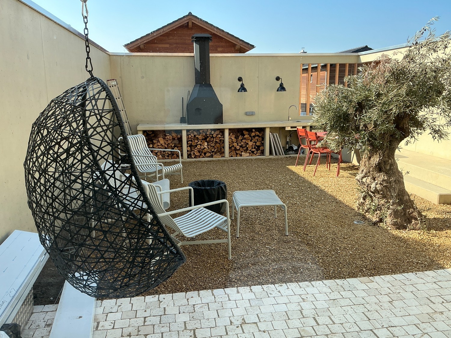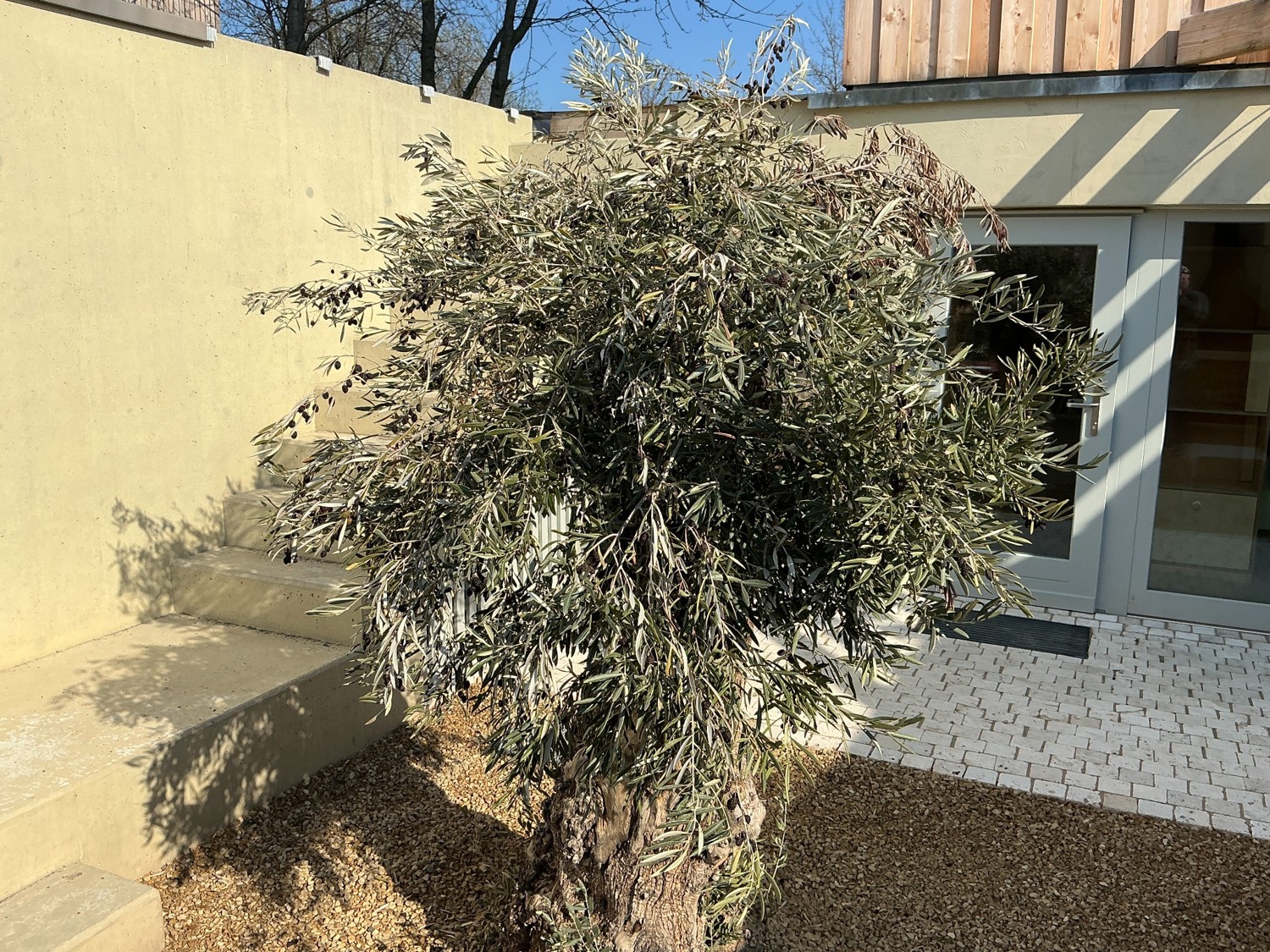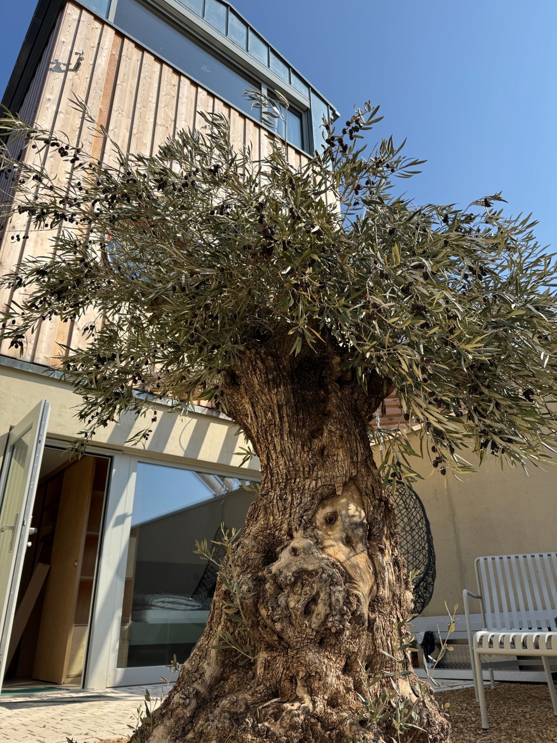 Der Patio bildet das Herz des Außenbereichs: ein nach oben offener Innenhof, der einen geschützten Rückzugsort schafft – ideal zum Verweilen, Grillen oder für lange Abende an der Feuerstelle. In seiner Mitte steht ein über 60 Jahre alter Olivenbaum, der dem Hof eine besondere Atmosphäre verleiht. Sitz- und Chillmöbel, Grill sowie Feuerstelle laden zum Entspannen ein, während der Bereich gleichzeitig vor Blicken Dritter geschützt ist.