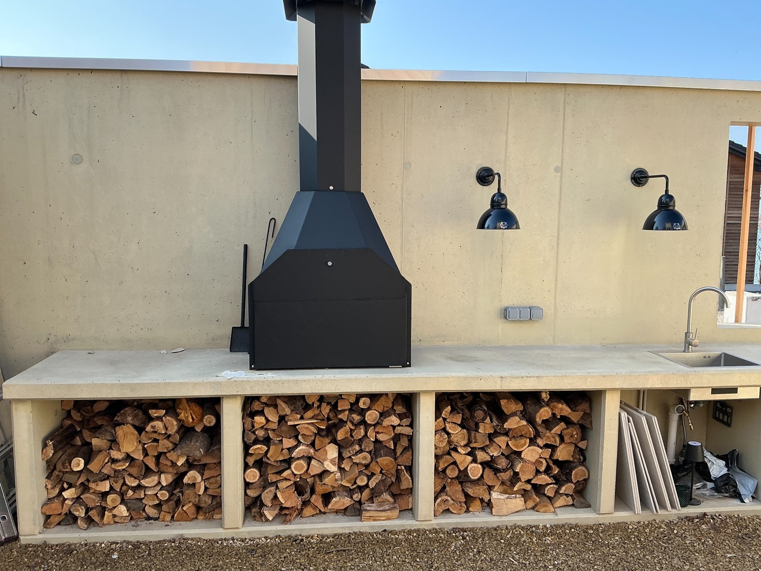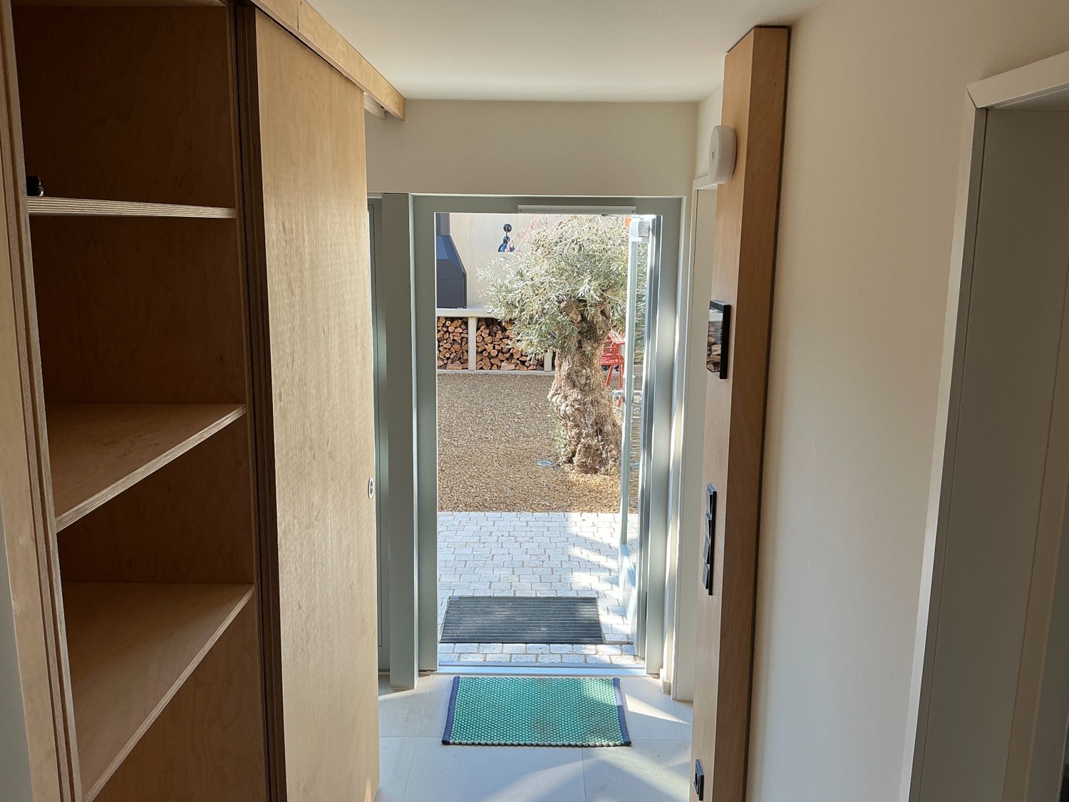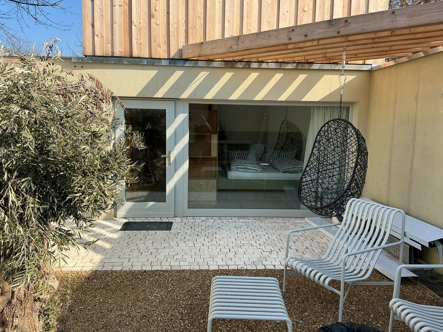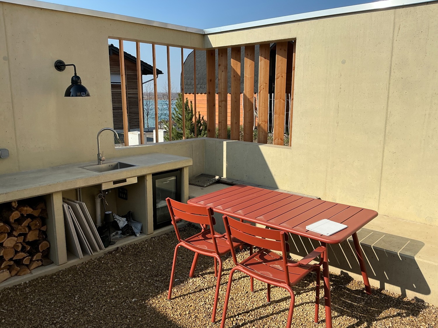 Der Patio bildet das Herz des Außenbereichs: ein nach oben offener Innenhof, der einen geschützten Rückzugsort schafft – ideal zum Verweilen, Grillen oder für lange Abende an der Feuerstelle. In seiner Mitte steht ein über 60 Jahre alter Olivenbaum, der dem Hof eine besondere Atmosphäre verleiht. Sitz- und Chillmöbel, Grill sowie Feuerstelle laden zum Entspannen ein, während der Bereich gleichzeitig vor Blicken Dritter geschützt ist.