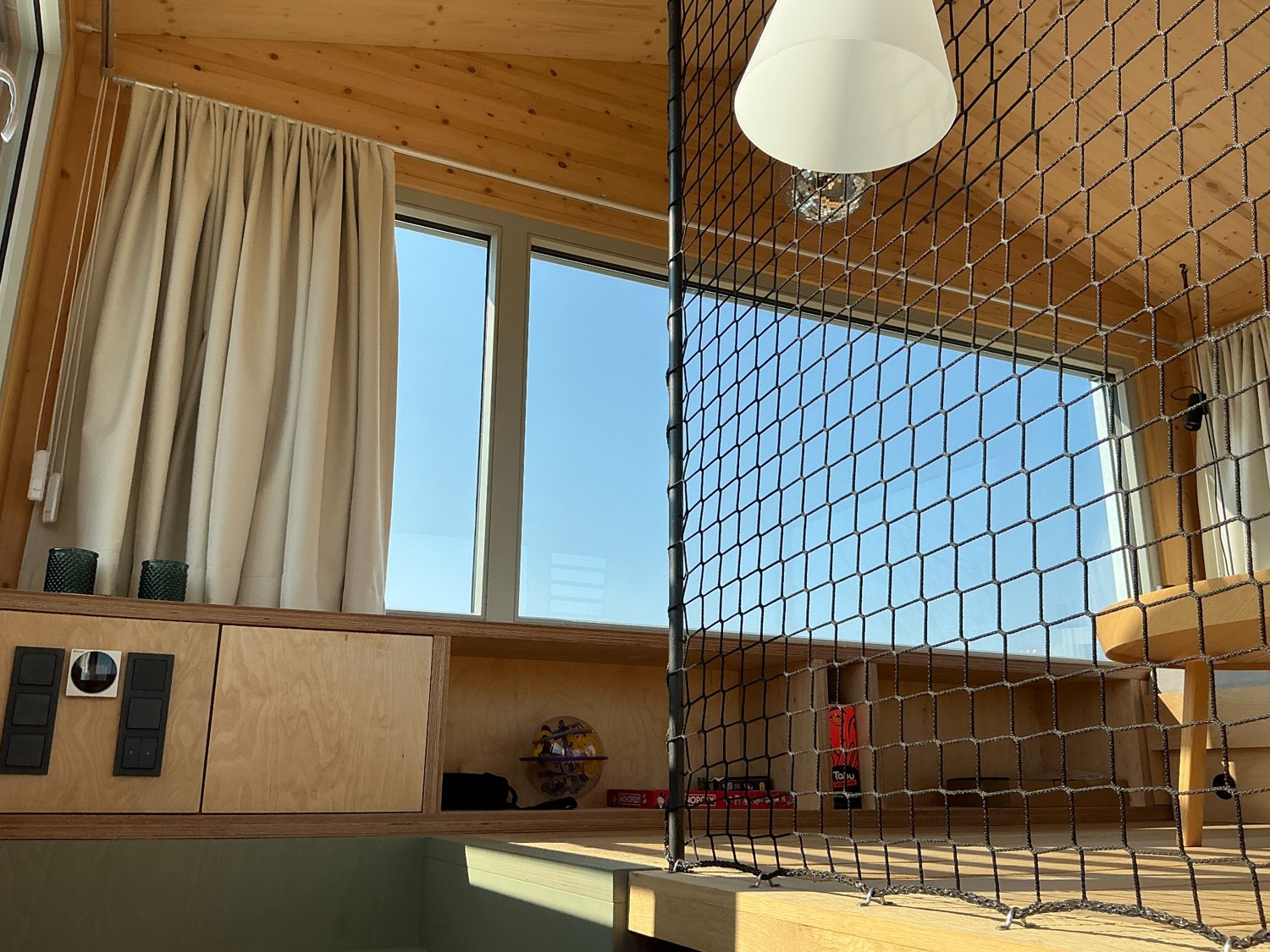 Im 1. Obergeschoss liegt der zentrale Wohnbereich mit voll ausgestatteter Küche und Esstisch. Kühlschrank, Herd, Backofen, Geschirrspüler sowie Filterkaffeemaschine, Toaster und Wasserkocher stehen bereit. Von hier aus schwebt eine besondere Schlafkoje für zwei Personen mit einer Matratze (1,80 × 2,00 m) von der Dachdecke in den Raum und verleiht dem Haus seine besondere Atmosphäre.