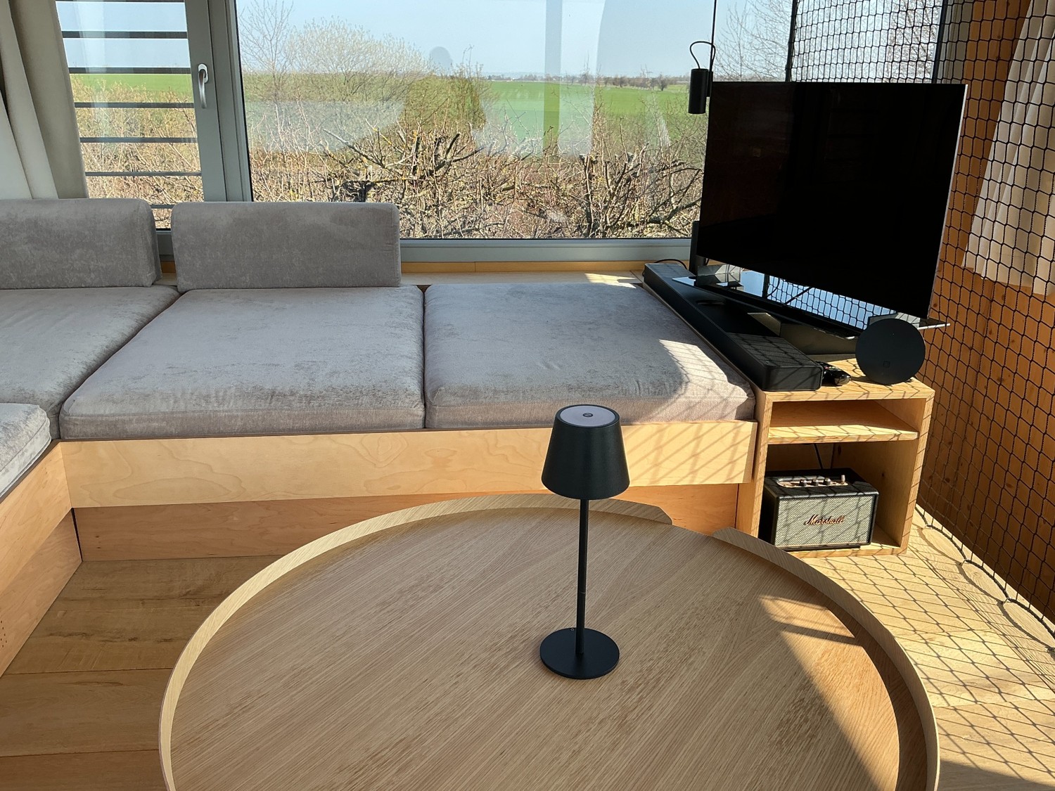 Im Dachgeschoss lädt eine gemütliche Lounge mit großer Couch, TV, Bluetooth-Lautsprecher und Spiegelkugel zum Entspannen ein. Holzdielen und eine Klimaanlage mit Heizfunktion sorgen hier für ein angenehmes Raumklima zu jeder Jahreszeit.