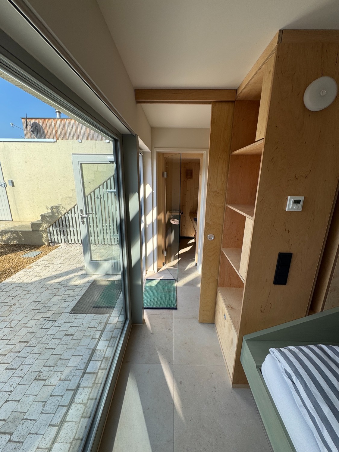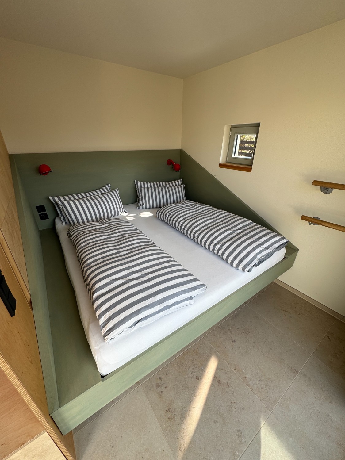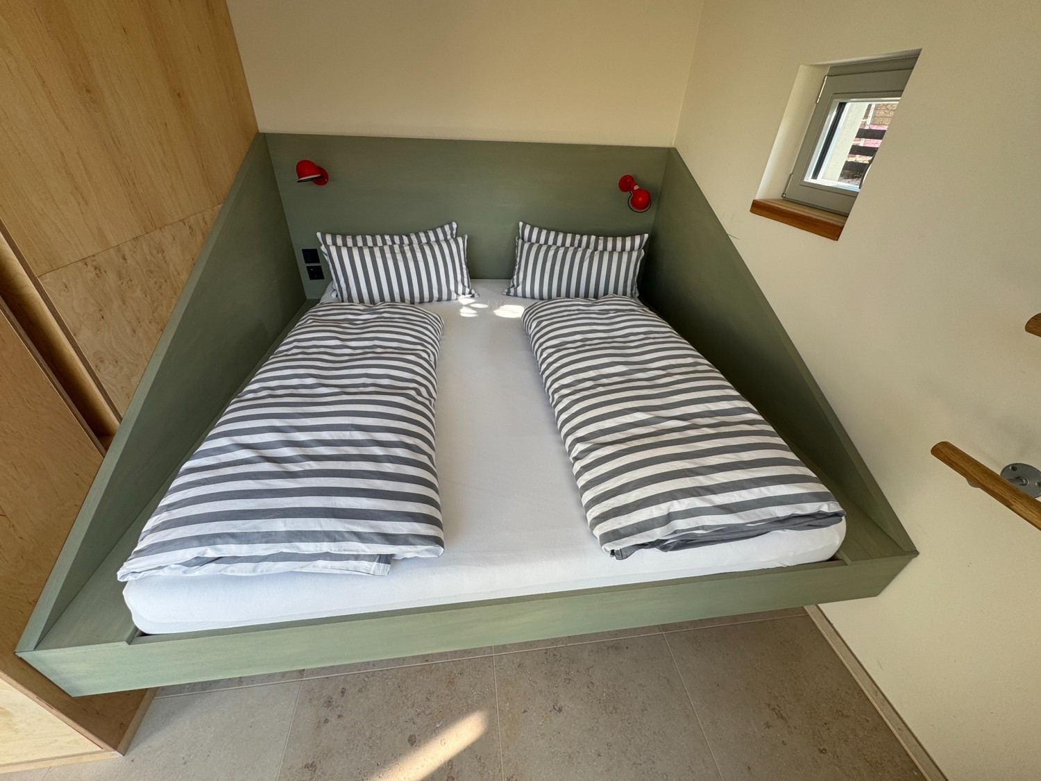 Fenster, Fliesenboden, Fußbodenheizung, Bett 1,80 × 2,00 Meter, Verstaumöglichkeiten