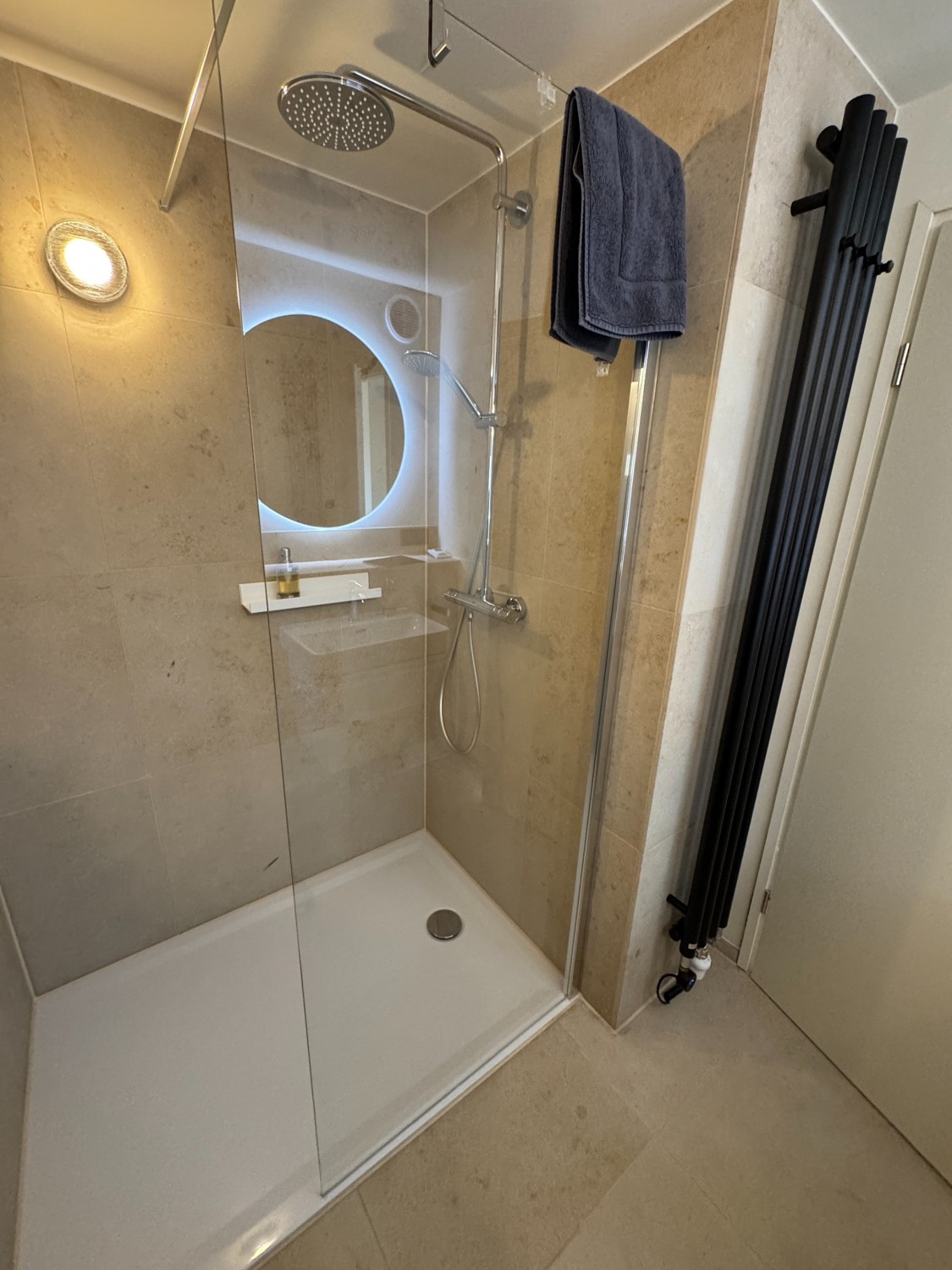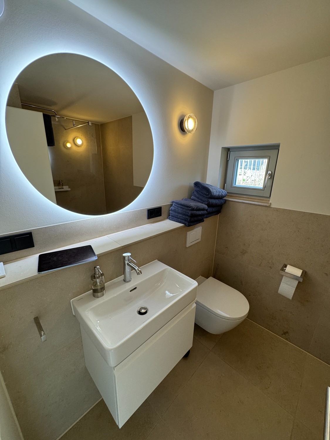 Fenster, WC, Dusche, Waschbecken, Spiegel, Fön, Handtuchheizung, Fußbodenheizung, Fliesen, Erstausstattung Hand- und Badetücher (Strandtücher bitte selbst mitbringen)